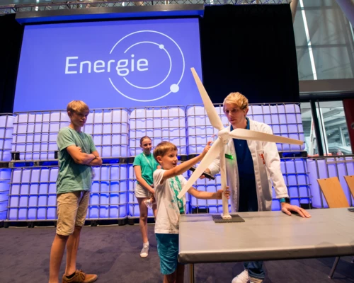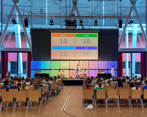 Auf der Show-Bühne werden Experimente und Forschungsergebnisse des Tages präsentiert und mit einem Live-Quiz das erarbeitete Wissen abgefragt.